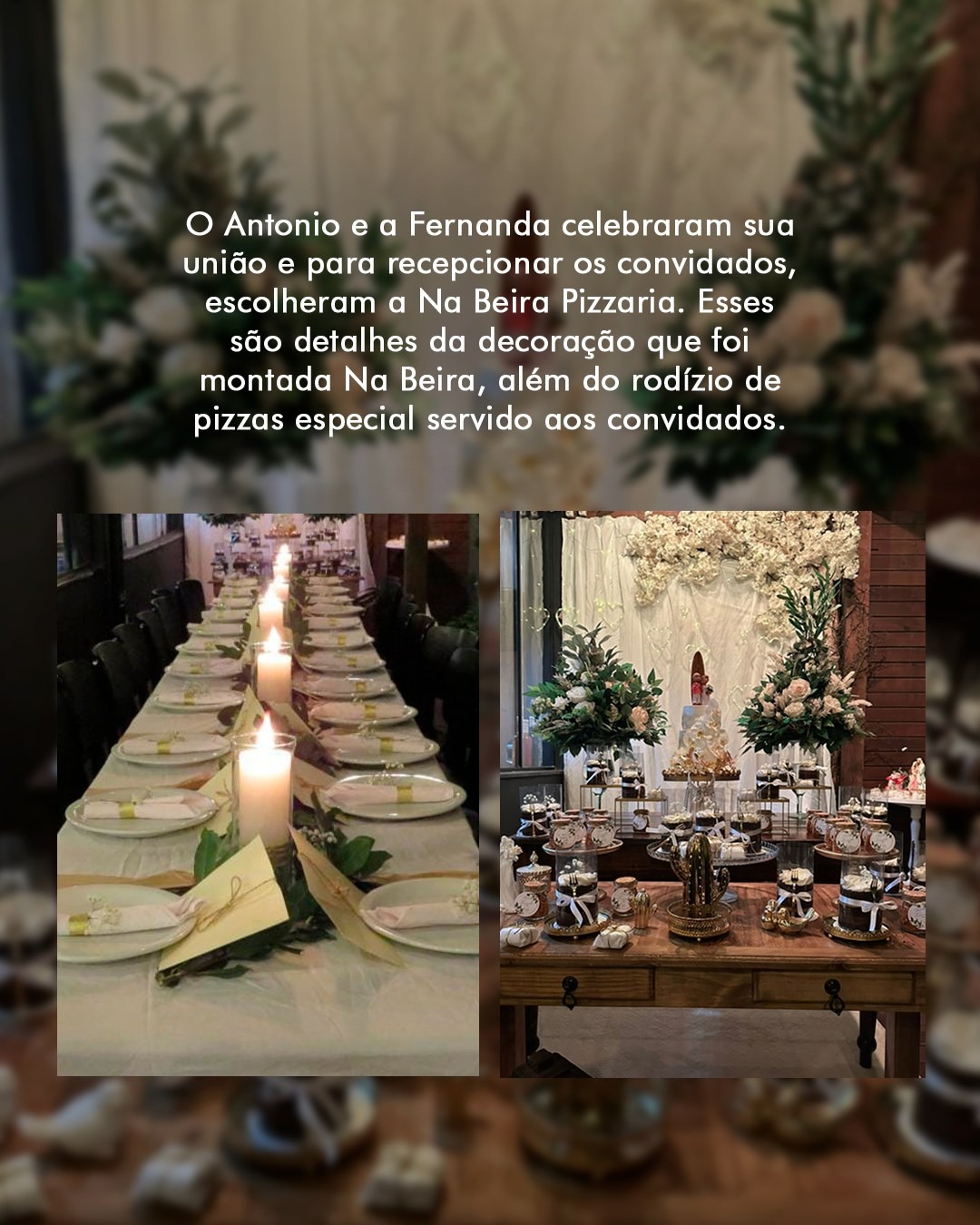 No Na Beira Pizza Bar, criamos o cenário perfeito para o seu evento — com um ambiente sofisticado, atendimento acolhedor e um rodízio de pizzas irresistível.